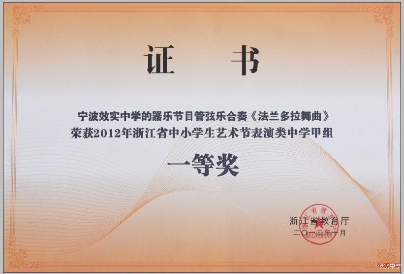 喜报!我校管弦乐团演奏的《法兰多拉舞曲》荣获2012年浙江省中小学生艺术节表演类中学甲组一等奖。 ...