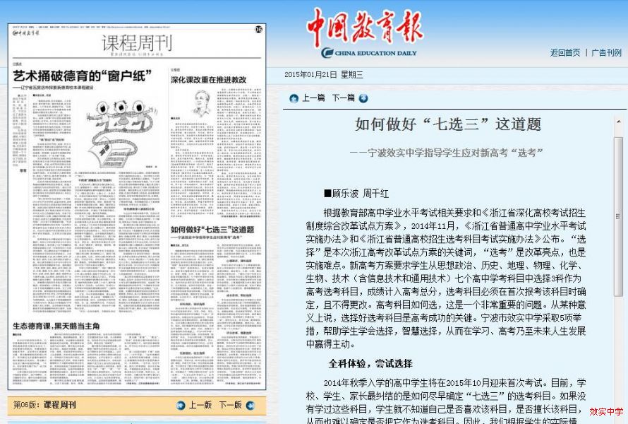 1月21日,《中国教育报》刊登《如何做好“七选三”这道题——宁波效实中学指导学生应对新高考“选考”》一文,报道我校应对新...