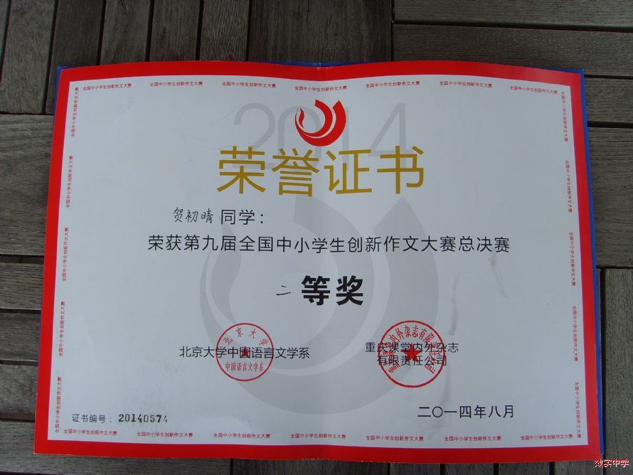 我校贺初晴同学在第九届全国中小学生创新作文大赛总决赛中获奖