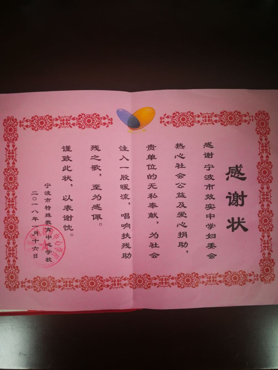 2018年1月16日,为答谢宁波效实中学妇委会热心社会公益、爱心捐助,宁波市特殊教育中心学校特发感谢状。 ...