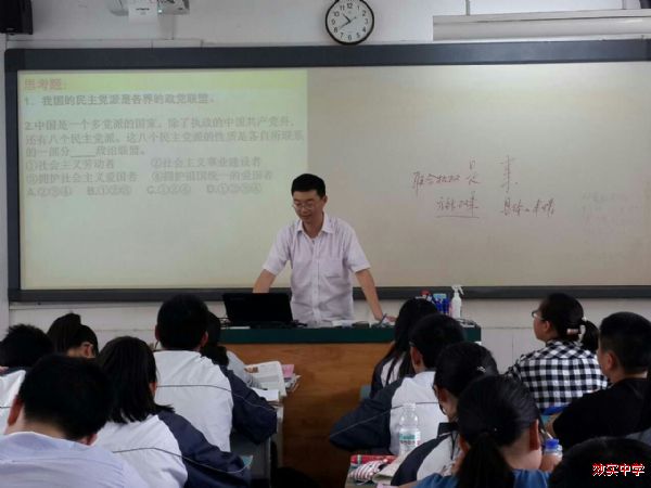 58日,效实中学松阳一中《共产党领导的多党合作和政治协商制度:中国特色的政党制度》同课异构活动在我校成功举行。全体政治组教师和师训中心新入职教师一起聆听了各具风格的两堂课,我校王剑平老师语言幽默风趣,针对教学重难点,在学生自学的基础上结合文本层层递进,分析深刻透彻,并适时穿插学校民主党派的案例和精心编制的题目,增进学生理解,培养了学生思辨和分析能力。松阳一中姜金莉老师以《建国大业》中的视频片段为切入点,创设问题情境,学生合作探究,归纳构建知识,最后结合中国梦的时政内容,充分激活了学生思维。姜老师语言亲切生动,与学生互动默契,课堂气氛活跃。