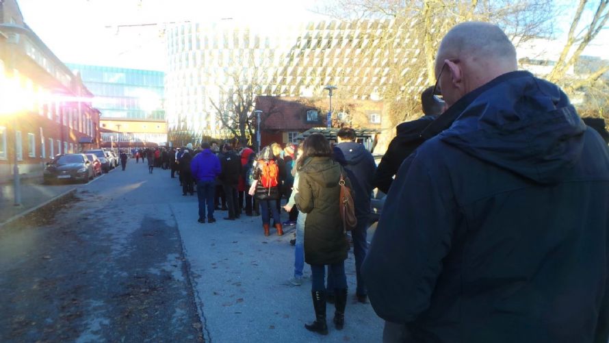 我于中午11点40分左右赶到卡罗林斯卡医学院,礼堂门前已经排起长龙,据我粗略估计至少有100米。而且,排队的人里面有一半是华人。更有甚者,我在去的公交车上就遇到了4个从斯德哥尔摩大学和瑞典皇家理工学院KTH)赶来的中国留学生。