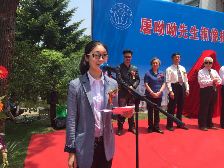 效实中学学生会主席蒋楚沁同学代表效实学子发言。她表示,校友屠呦呦先生用实际行动向我们诠释了科学家对科学研究的一片冰心,效实学子将铭记她的杰出成就与高尚品格,并在学术和人格上严格要求自己,为母校增光添彩。