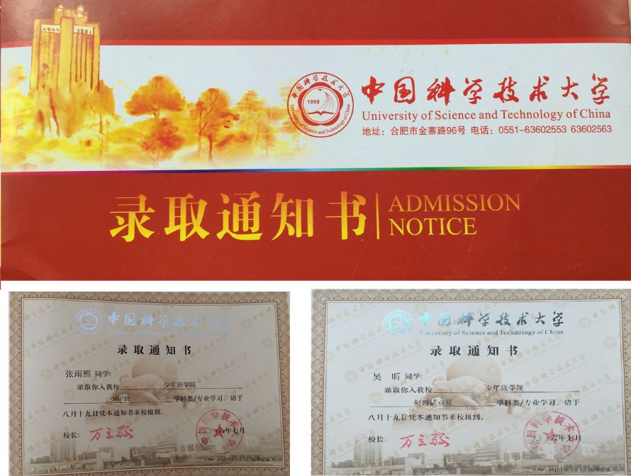 日前,我校高二(2)班张雨熙同学收到中国科技大学少年班的录取通知书。张雨熙同学是我校“00后”学生中第一个被大学录取的学生。