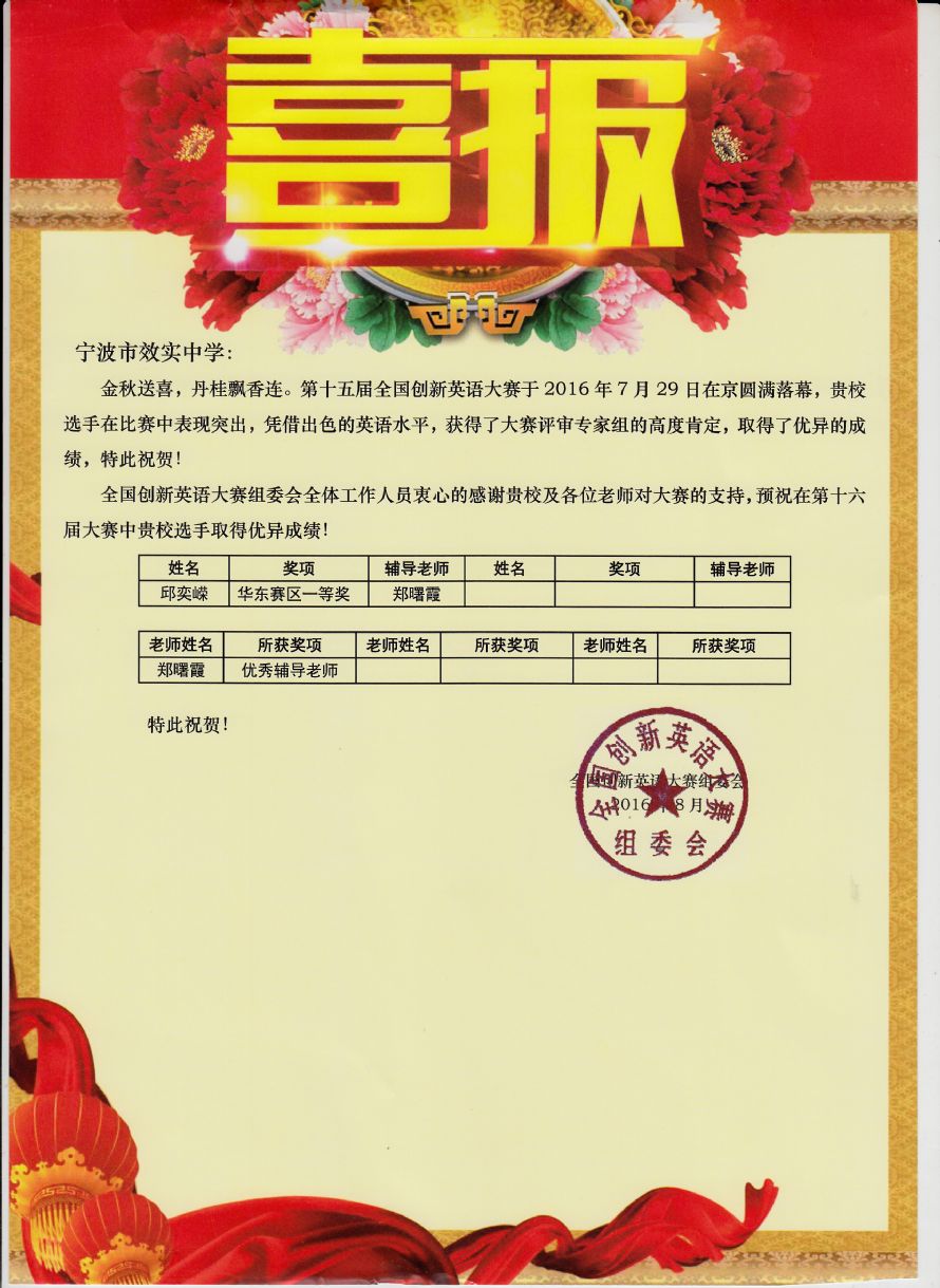邱奕嵘同学获全国创新英语大赛华东赛区一等奖