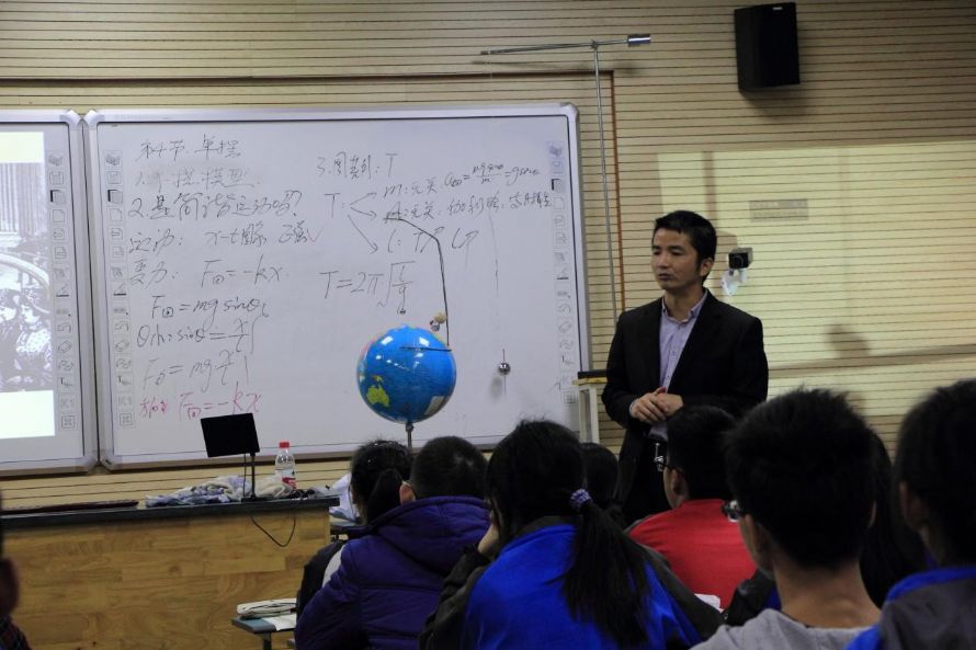 慈溪市实验高级中学高益忠老师带来了一堂别开生面的“单摆”展示课,教学过程充分体现了“从生活走向物理,从物理走向社会”的学科教学理念。高老师从生活中的钟摆、吊篮等实际例子引入单摆模型,又通过列举不同的悬线和悬挂物让学生思考体会单摆模型的条件。此外为了让学生理解判断单摆是否是简谐运动的依据,高老师当场和学生一起做了红墨水匀速抽纸实验,拍下照片,随即放到电脑上与正弦函数曲线比对,从而得出结论,不仅突出了重点、突破了难点,还灵活地将现代教育技术融入到物理课堂教学中。课堂的最后高老师用地球模型形象地演示了傅科摆验证地球自转的原理,适当拓展,极大地激发了学生学习物理的兴趣。
