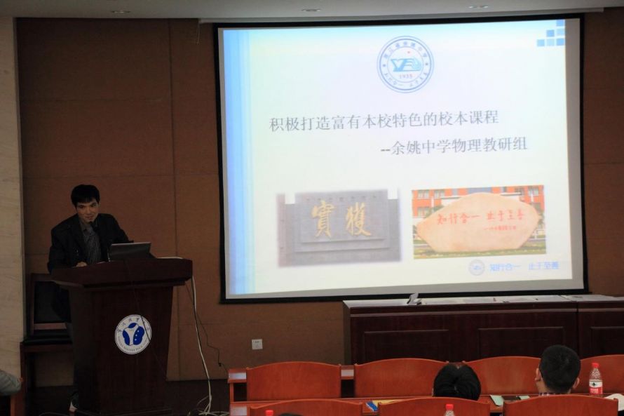 其次在学科基地学校汇报环节中,效实中学、慈溪中学和余姚中学作为宁波市三所普高物理学科基地学校分别进行了基地建设的成果展示汇报。效实中学物理组组长袁张瑾老师从“建设和谐争辩学术型氛围的教师团队、构建效实特色银杏树形状的课程体系、搭建满足学生差异化需求的培养平台”这三个方面进行了全面细致的介绍,充分凸显了效实中学独具特色且一贯秉持的“求真·贯通·创新”教育教学理念。慈溪中学物理组刘建浩老师简单介绍了慈溪中学物理组成员,并在选修课建设、课题研究和教师专业成长方面进行了着重介绍,组内教学成果和科研成果丰硕。余姚中学物理教研组长胡志鹏老师则重点介绍了本校颇具特色的校本课程体系架构和教学实施情况,其中有关物理的校本课程包括初高中物理衔接、物理创新思维训练、物理技术的应用与摄影技术的发展等,选修课堂灵活多样,发展培养了学生多方面的能力。