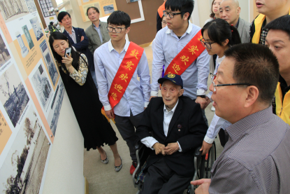 在老师、志愿者与学生代表的陪同下,邬汉忠老人参观了校史陈列馆。校史陈列馆里,老人的目光就一直没有离开过墙上的照片资料,一张张老照片激起了老人家积淀内心多年的回忆。老人家耳聪目明,目光矍铄,与他交流毫不费劲。刚入效实园时,老人便提出还记得效实的校歌,在陈列馆的校歌乐谱前,老人兴致勃勃,即兴唱起了校歌。老人家的歌声向我们诠释了这首百年校歌的深刻意义。