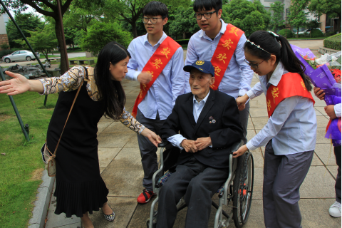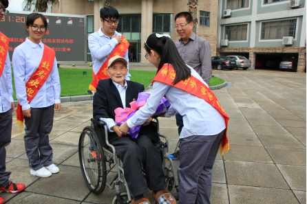上午九点半左右,老人在家人和社会爱心志愿者的陪同下来到效实中学门口。周千红校长、张悦副校长、高燕萍老师、陈强老师与我校学生志愿者在老校门门前迎接老人的到来。见到邬汉忠老人时,很难相信他已经92岁了。老人家一身西装,佩戴着黄埔军校的校徽,精神健朗。与老人家问好后,众人和老人在效实老校门前合影,并向老人献上鲜花。