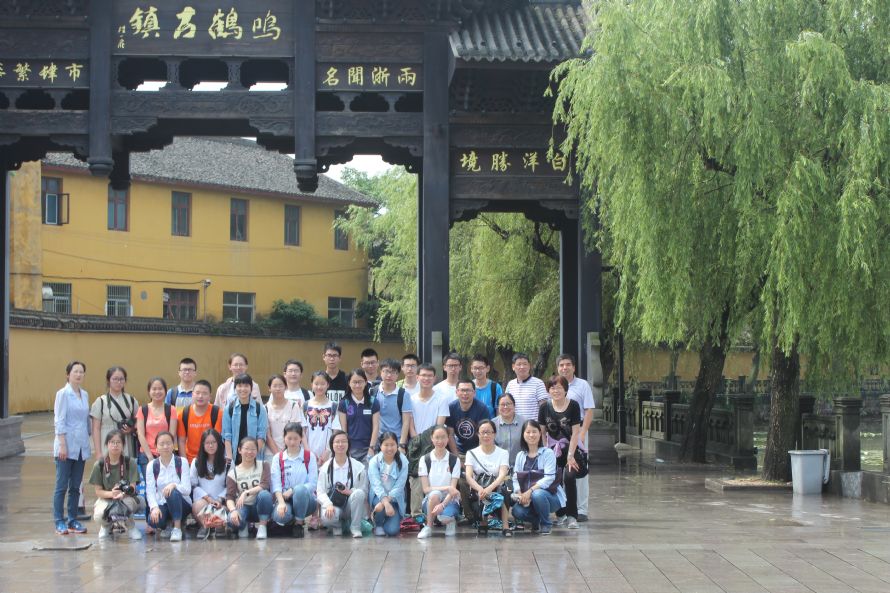 本着这样的目的,史社成员以及历史组老师们在上午八点左右到达此次活动的第一站——慈溪鸣鹤古镇: 鸣鹤镇,亦称鹤皋,是个古老而秀丽的江南小镇,风光旖旎,人杰地灵,依水成街,因河成镇,镇边修寺,寺旁湖建。 天公作美,一小会的暴雨后是湛蓝的天和新鲜的空气。在这里,社员们参观了正在改修的盐仓24间走马楼、清代豪宅银号(已成为五叶级名宿——银号客栈)、叶心培先生创办的崇敬堂(国医馆)、承德堂和叶氏小五房等独具特色的鸣鹤景点。了解了鸣鹤由兴盛到衰落的历史纵横,也明白了宗法制、草市、青瓷等教科书中的知识在明鹤的真实体现。值得一提的是,鸣鹤古镇由于商业化程度低、旅游开发较少,很好地保留了其曾经的风貌,在这里,你可以随时驻足、抬头,檐崖屋瓦间,绿叶碧天下,处处都是景致。