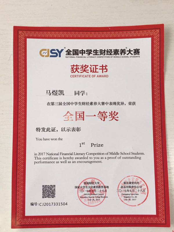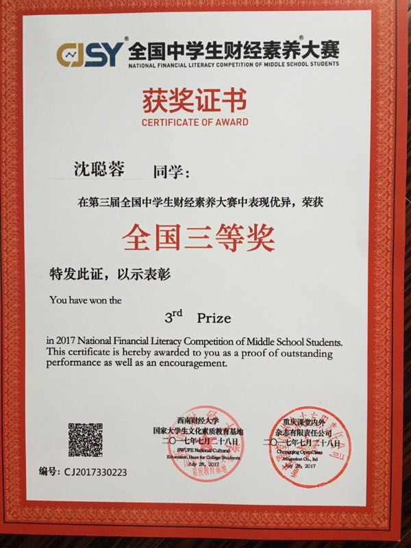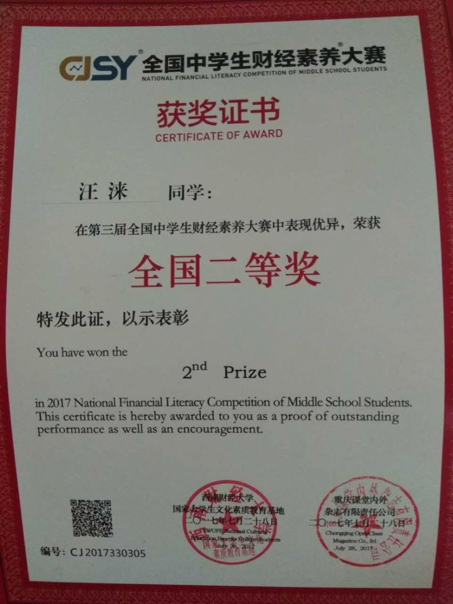 第三届全国中学生财经素养大赛吸引了来自全国32个省、直辖市的93857名高一高二学生报名参加此次比赛,经过初赛、复赛,共有629名学生闯入了全国总决赛。总决赛于7月26日—28日在成都西南财大柳林校区举行,来自中国财政科学研究院、西南财经大学、上海财经大学、中南财经政法大学、东北财经大学、中山大学的专家担任本次大赛决赛面试评委,保证决赛的权威、公平、公正。经过笔试加面试的综合较量,我校三名学子取得佳绩。其中,1801班马煜凯荣获全国一等奖,1803班汪涞荣获全国二等奖,1904班沈聪蓉荣获全国三等奖。