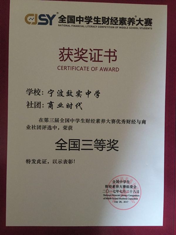 同时,我校商业社在“第三届全国中学生财经素养大赛优秀财经与商业社团评选”中也取得佳绩。该社团评选自2017年4月21日活动启动以来,共有来自全国范围的107所高中社团报名参加,最终评选出一等奖1名,二等奖3名,三等奖6名,优秀奖5名。我校“商业时代”商业社脱颖而出,荣获全国三等奖。