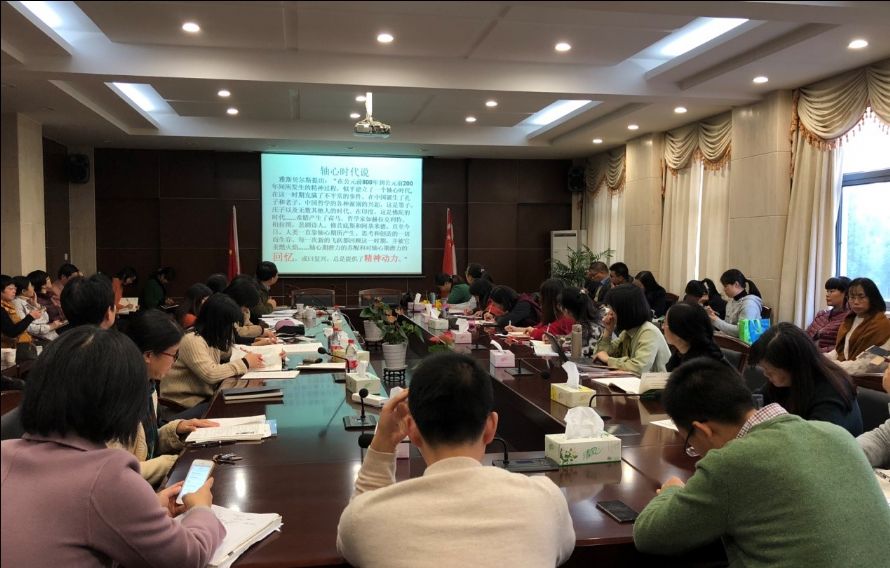 1128日下午,在行政楼230会议室, 外语组的何泽老师和我校及松阳一中的老师们分享了他的小专题·共同体讲座柏拉图教育思想简介---以《理想国》的三个隐喻为例