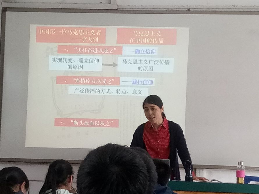 ……4月26日下午,历史组张碧荣老师挑战性的以必修三专题三第三课《马克思主义在中国的传播》一课作为教学的研习课例,省历史教研员戴晓萍老师、市历史教研员徐玉萍老师给予指导,兄弟学校和本校的历史老师参加听课。张老师进行了历史教学一线课堂如何接轨新课标的有益探索。张老师精选了丰富、经典的文字和图片材料,以李大钊“勇往奋进以赴之”——“确立信仰”,“瘅精瘁力以成之”——“践行信仰”,“断头流血以从之”——“捍卫信仰”的一生为主线,分析了马克思主义在中国传播的原因、概况和意义,还根据材料对教材的有关表述提出了商榷。较好地渗透了唯物史观、时空观念和史料实证等历史核心素养,也让学生感受到作为真正共产党人李大钊先生坚定的理想信仰和深厚的家国情怀。