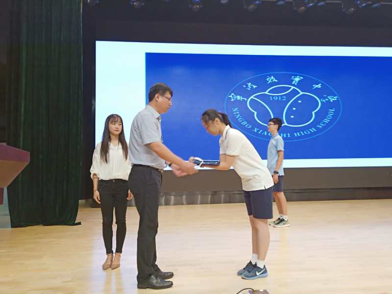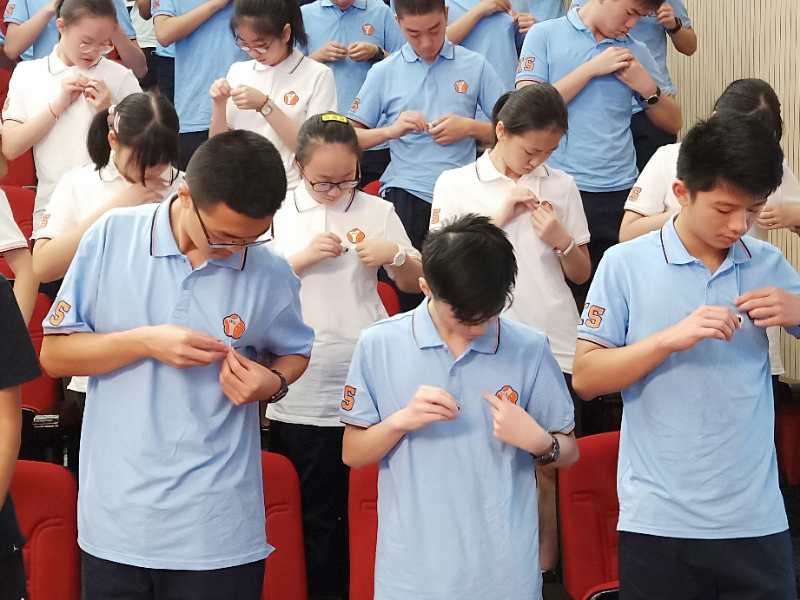 裘校长郑重地将校旗交授至学生手中,这是一份荣誉,更是一份责任与义务的传递。学生们认真地将效实校徽郑重地佩戴在前胸上,从此,效实的徽标将在每一位效实学子胸前熠熠生光,“今日我以效实为荣,他日母校以我为荣”!