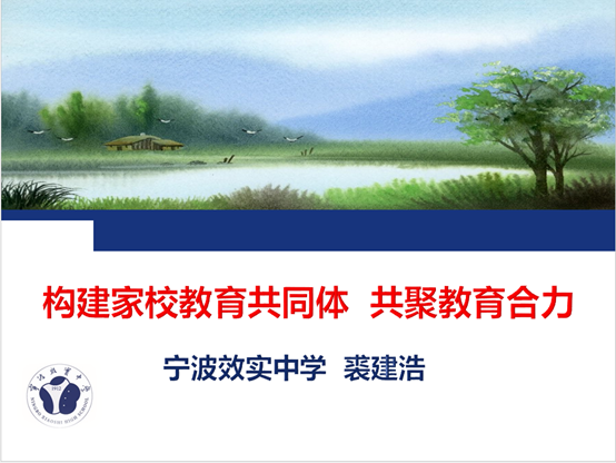 大会议程一:裘建浩校长作《构建家校教育共同体 共聚教育合力》的报告。