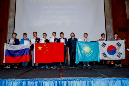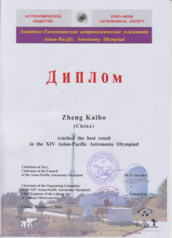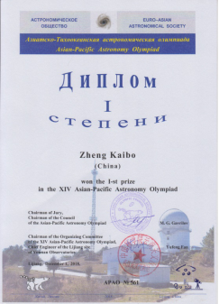 第十四届亚太天文奥林匹克竞赛(14th Asian-Pacific Astronomy Olympiad)于2018年11月24日至12月2日在丽江举办。来自中国、俄罗斯、韩国、哈萨克斯坦等国家代表队的49名青少年天文爱好者组队参赛。本届竞赛历时8天,由欧亚天文学会、北京天文馆联合主办,丽江市科学技术协会等多家单位联合承办。比赛参赛队员年龄为13-18岁之间,均为各国奥林匹克竞赛中选拔出的优胜者,根据参赛选手年龄分为高年级组和低年级组两个组别,分理论竞赛、观测竞赛和实测竞赛三个环节进行比赛。中国队荣获佳绩:包揽本届比赛的唯一两枚金牌,分别为李晨祺(高年级组)和郑凯波(低年级组)。我校东部校区高一8班学生郑凯波获得低年级组金牌和总分最高奖。