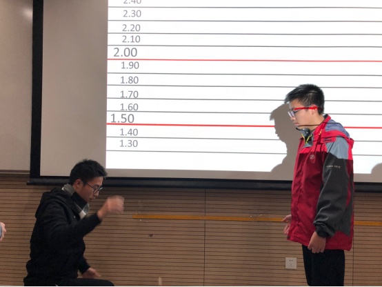 下午第四节课,比赛正式开始。此次比赛的评判标准是比较各组子母球从一定高度落地后子球弹起的高度。同学们为了赢得比赛,可谓八仙过海,各显神通:绝大部分同学选择将篮球作为母球,弹性小球作为子球进行比赛;也有同学精益求精,为了达到最佳碰撞效果在母球上安装了固定子球的支架;更有同学另辟蹊径,以排球作为母球或是将子球改为高尔夫球。比赛的角逐异常激烈,大家的发挥也远远超出了老师们的预想。最初设定的测量上限2.5米已远远不能真正衡量子球弹起的高度,频频有队伍的子球撞上天花板,甚至弹进隔层内部。