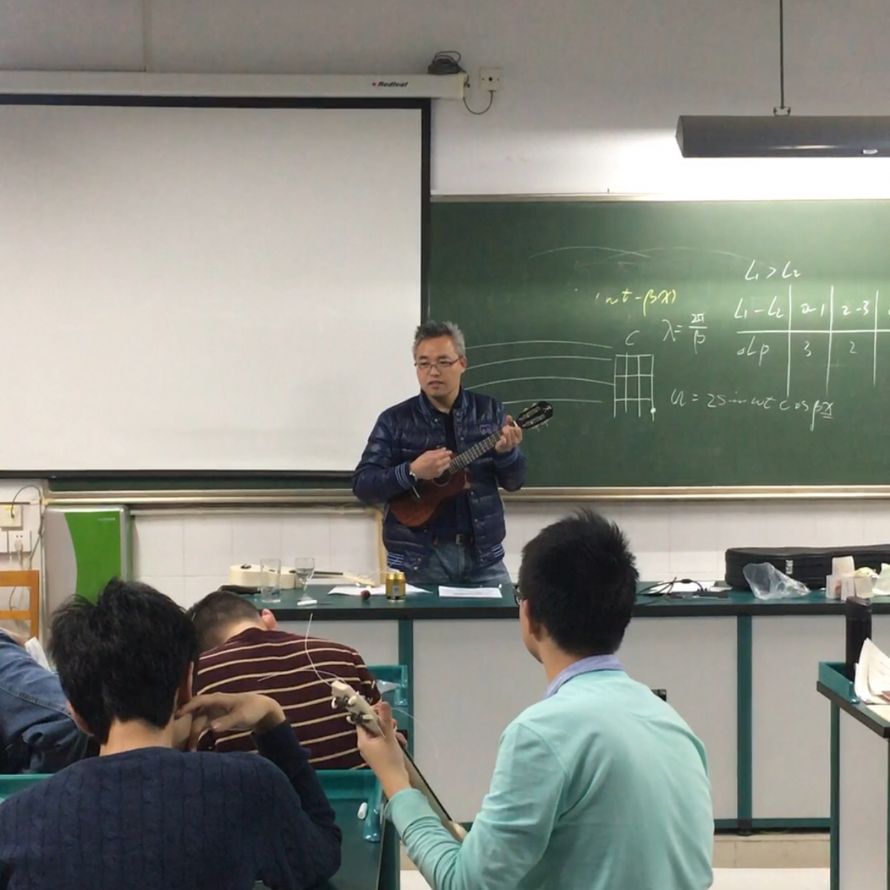 这门物理选修课可以说是别出心裁。一门课涵盖了劳技、物理、音乐等多个学科内容,我校高二物理学科鲍鑫鹏老师打破了纯碎的知识点讲解的壁垒,而是从学生兴趣点出发,让学生手工DIY尤克里里,结合在制作中的各种因素充分认识声音在不同环境下的变化和其原理。通过理论和实践相结合,让学生对知识点有了更深层的理解。最后还特别邀请了物理组张海军老师(我校望京路一号电声乐队吉他手)现场为学生教授并演奏生日快乐歌,让选修课堂显得更加的丰满和充盈。