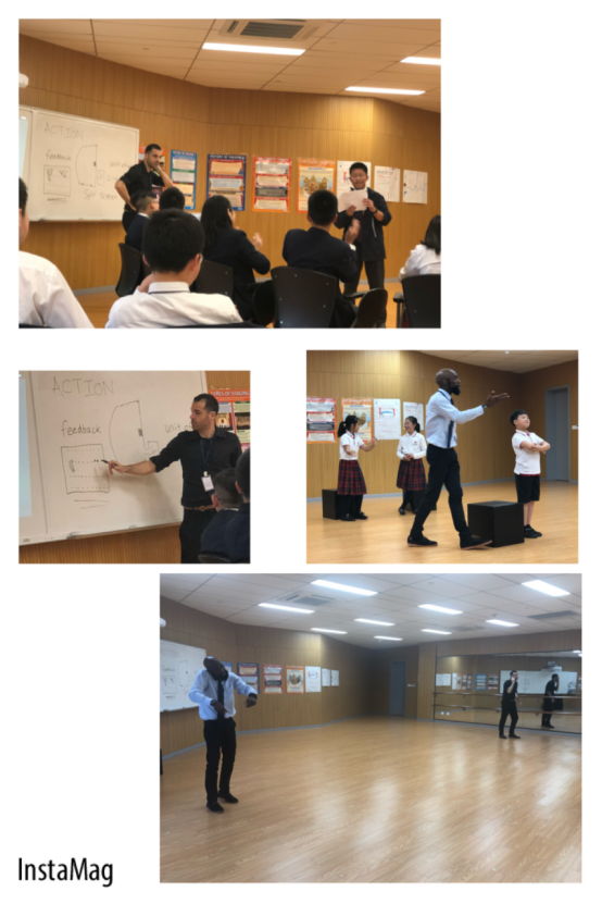 我们主要观摩了4年级、7年级的戏剧课,每次课后,我们组员们都有很多问题,两位老师热心又耐心地做专业解答,如莎剧中特有的一些元素,演员上下走台的要求,黑箱的妙用,如何对演员做专注力、快速反应等微技能训练。Mr. Stalder 还带我们来到他引以为傲的Blackbox (黑盒)剧场观看演出。(黑盒是指专为小型或实验性戏剧而设的小型剧场)。他给我们一一介绍并演示种种道具、音响、灯光等等一应俱全的专业设备。这是一场由六人组成的国际班学生出演的短剧,与第一天在大剧场七年级的内容一样,因为班额小,老师的指导频度很高,学生的表演明显自信与到位的多,在这小小的真实舞台,师生沉浸在剧情中,那意境好美……看来要把行业“做精做专”,软件与硬件支持都很重要啊!