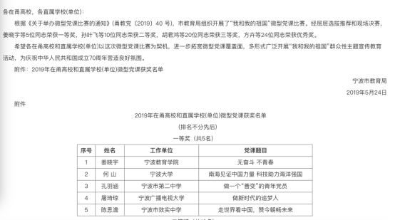 5月17日,为深入贯彻落实习近平新时代中国特色社会主义思想和党的十九大精神,庆祝中华人民共和国成立70周年,宁波市教育局组织开展了“点赞新中国,昂扬新时代”主题微型党课比赛活动。共有来自46家在甬高校、直属学校(单位)的59位选手参加本次比赛。