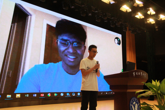 本想着这次讲座已经收获满满,没想到教授又公布了一个令人激动的消息——他将尝试与远在大洋彼岸的英特尔科学与工程大赛冠军——16岁的美国中学生Krithik连线。经过一段时间的调试,Krithik的身影终于出现在屏幕上全场顿时掌声雷动气氛达到高潮Krithik也被同学们的热情感染。他鼓励同学们接触新的领域打开自己的眼界并与时俱进Krithik耐心倾听同学们的问题并一一作答,以下是同学们的问题和Krithik的答复:
