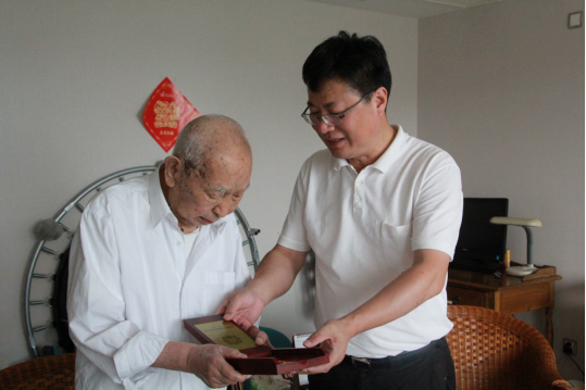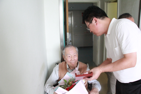 裘建浩校长为谢充老师送上纪念章,胡书记关切询问老人家的健康状况和日常生活状况,表示学校将一如既往为退休老教师做好服务,切实为他们解决实际问题。