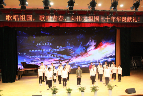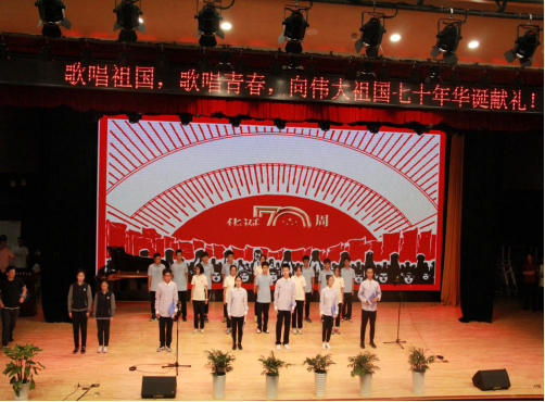 首先登场的是D2205班,带来节目《咱们的中国》。气势雄壮的开场,富有感情的朗诵间,穿插着小提琴演奏。所有同学或站或坐、错落有致,表演结束后,《我和我的祖国》悠扬的主旋律仍在我们耳边重复环绕。