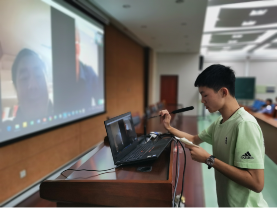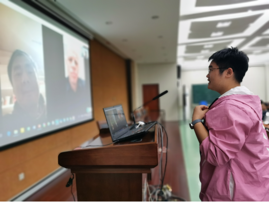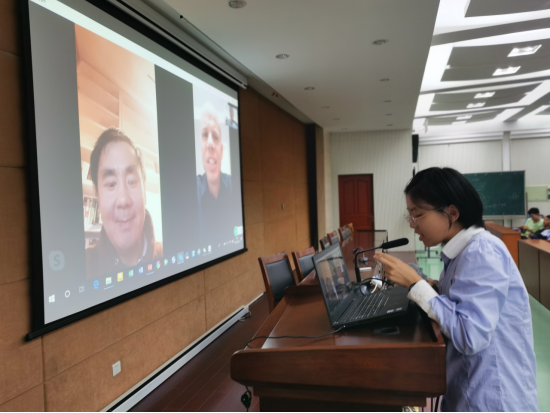 随后是最令人期待的三方互动问答时间。利用Skype软件,谌教授联系上了身处美国的Chris教授,同学们用热烈的掌声欢迎了凌晨两点还坚持为我们答疑解惑的Chris教授。一位三班的女生首先提问。