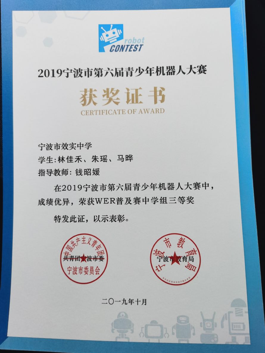 我校学子喜获宁波市青少年机器人大赛WER普及赛一等奖