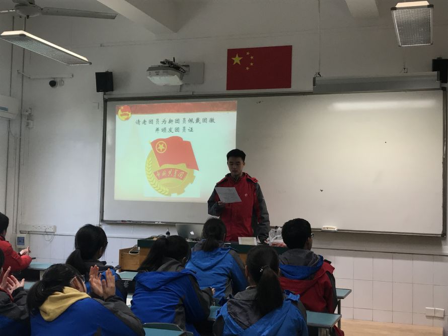 入团仪式在国歌声中开始,团委组织委员艾文可同学宣读了20位新团员名单,并由各班团支书为新团员们佩戴团徽、颁发团员证。新团员们在本年度参加了团校学习并通过了团校考试,向组织提出入团申请,由各支部考核并经支部会议通过,向校团委上报后经同意批准,正式加入共青团。团委陈思澹老师向新团员们强调了团的组织纪律要求,并提出了希望。最后,新老团员们共同齐唱团歌,本次入团仪式结束。