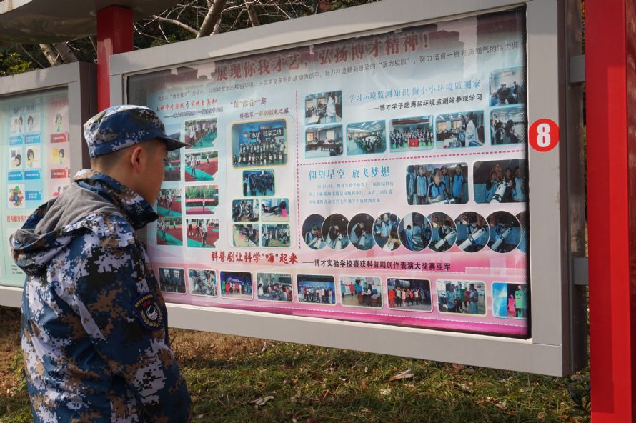 之后老师们来到了吴金金和龚宇轩两位同学的初中母校博才实验学校,孙立副校长向崔保祥校长送上感谢信,夸赞两位同学在高中期间的优秀表现。崔校长和王副校长热情地接待了来访教师,带领老师们参观校园,介绍了学校的办学规模、师资力量、教育理念和丰富的校园文化。恰逢假期,学生已经回家,校园里格外安静,但走廊两侧的学生书画作品和宣传窗里的学生获奖信息无一不在展现着学校所蕴藏的活力。吴金金找到了初中参加篮球赛和科普剧时的照片,兴奋地指给老师们看,脸上满是怀念与自豪。