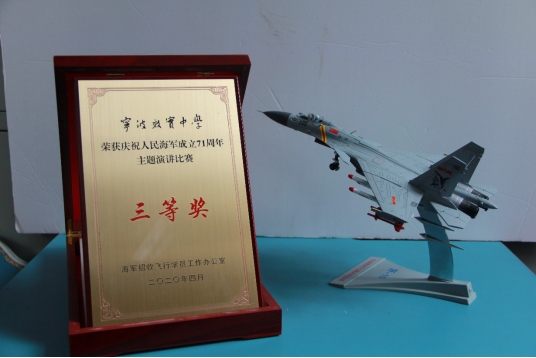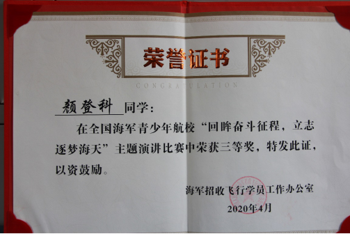 为进一步增强海航班学生了解掌握人民海军建设发展的光辉历程,坚定自己献身海军、矢志飞行的理想信念,在海军节到来之际,中国海军招飞办组织全国14所海军青少年航空学校开展了以“回眸奋斗征程,立志逐梦海天”为主题的演讲庆祝活动。通过“人民海军”微信公众号线上投票和海军招飞办组织的线下评审,我校海航2018级高二8班顔登科同学的主题演讲——《山因脊而雄》最终在全部14名选手中脱颖而出,夺得第四名并获三等奖,用声情并茂的演讲表达对海军生日的祝福。同时,宁波效实中学也因组织出色荣获庆祝人民海军成立71周年主题演讲比赛的三等奖。