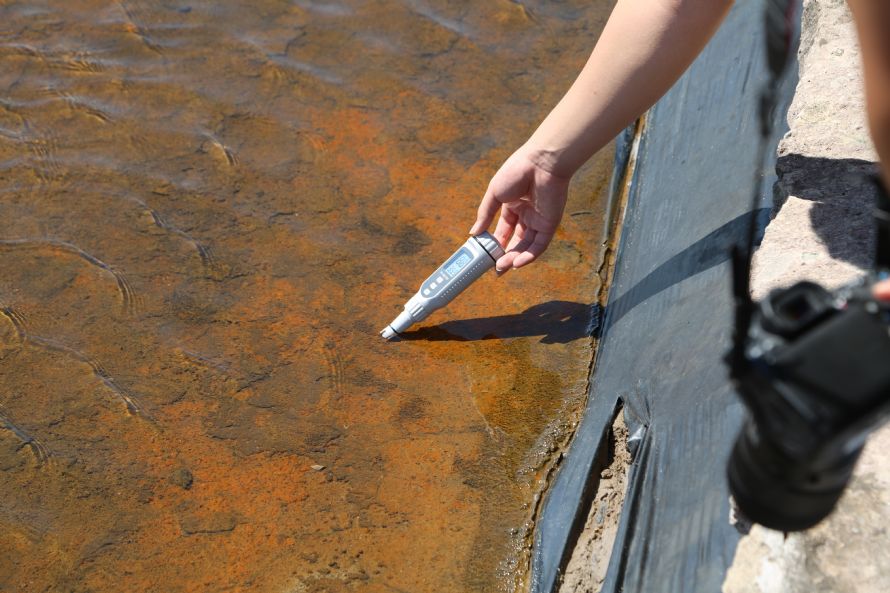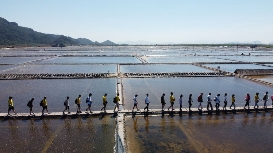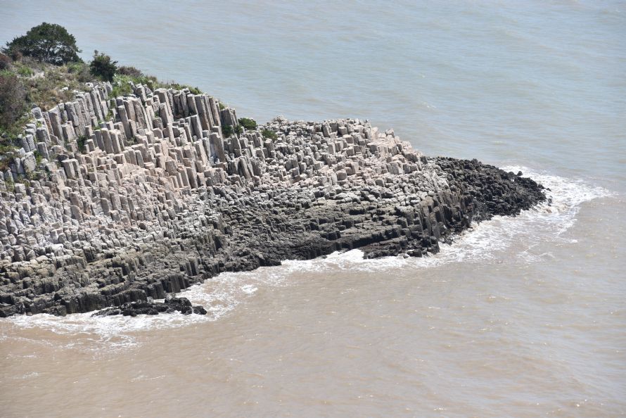 研学第二站,来到花岙岛。同学们先来到花岙石林。此处石林,是由玄武岩喷出后,经外力侵蚀作用形成。裸露的岩石可以看到,岩层的走向,倾角。同学们拿出地质罗盘,对这些岩石进行了测量,获取了花岙石林的一手地质信息。此后同学们又来到花岙盐场,通过实地走访、参观盐场,了解了海盐的生产过程,并对不同阶段的卤水进行了水质测量。