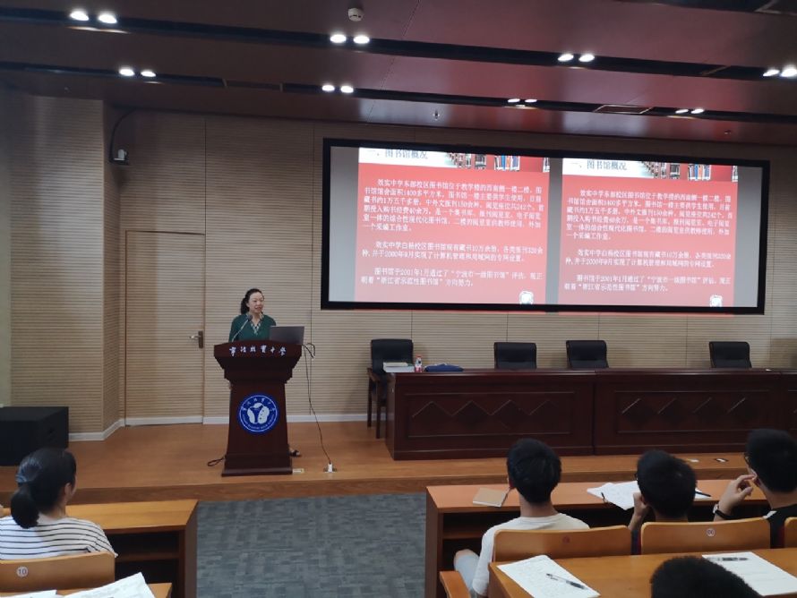 为了引导新生更好的利用图书馆的各类资源,图书馆老师对东部校区和白杨校区的高一新生分批进行了“新生入馆教育培训”,介绍了学校的图书馆概况,图书和报刊的借阅规则以及图书馆提供的服务等,讲解了《中国图书馆图书分类法》和图书分类体系的基本知识,及怎样利用宁波市数字图书馆的数字资源等。此外,还隆重介绍了我校图书馆收藏的三套皇家巨作,图书馆的震馆之宝:《四库全书》、《古今图书集成》和《永乐大典》。