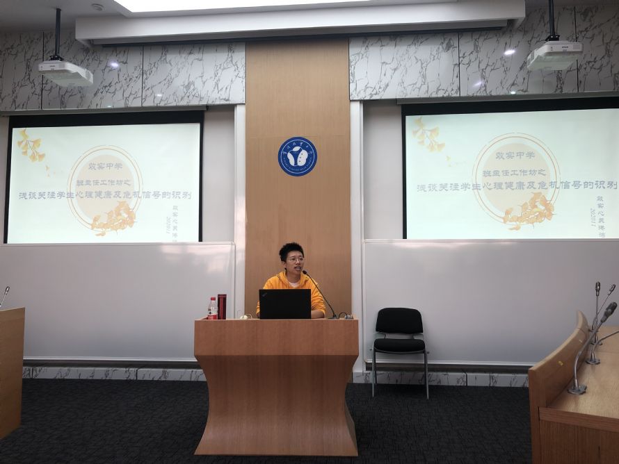 2020年11月3日,心理教师陈小霞和张盛楠给全校班主任做了关于学生心理疏导的讲座,两校区的班主任以视频连线的方式,对学生心理健康相关的问题进行了深入的沟通和交流。