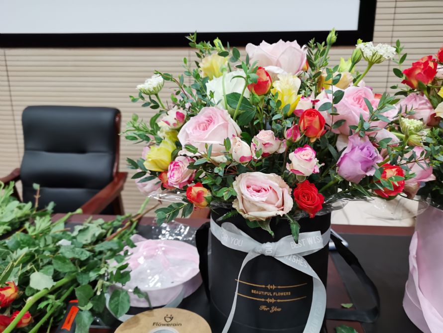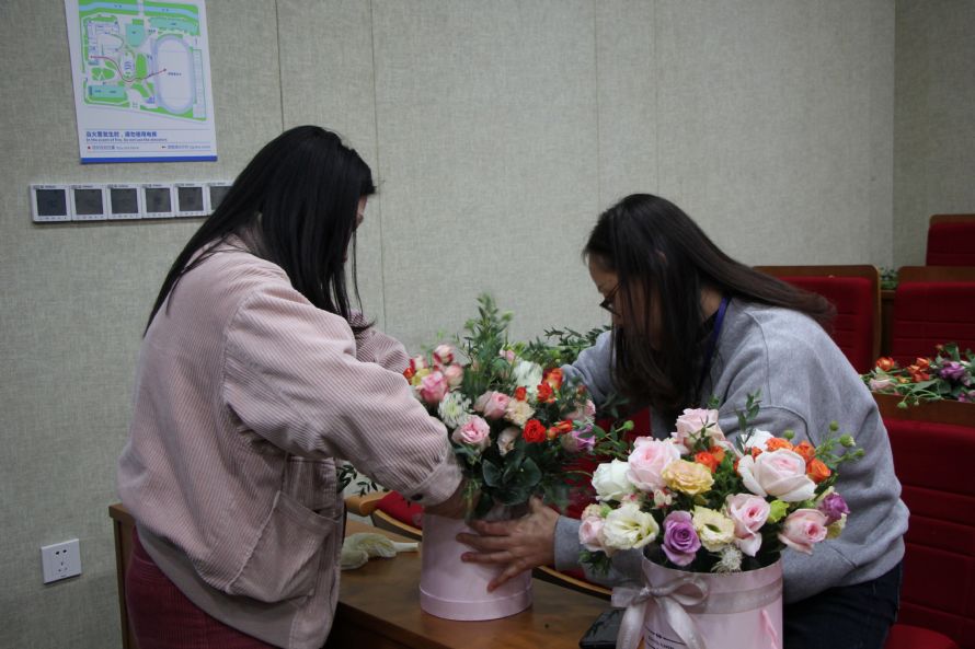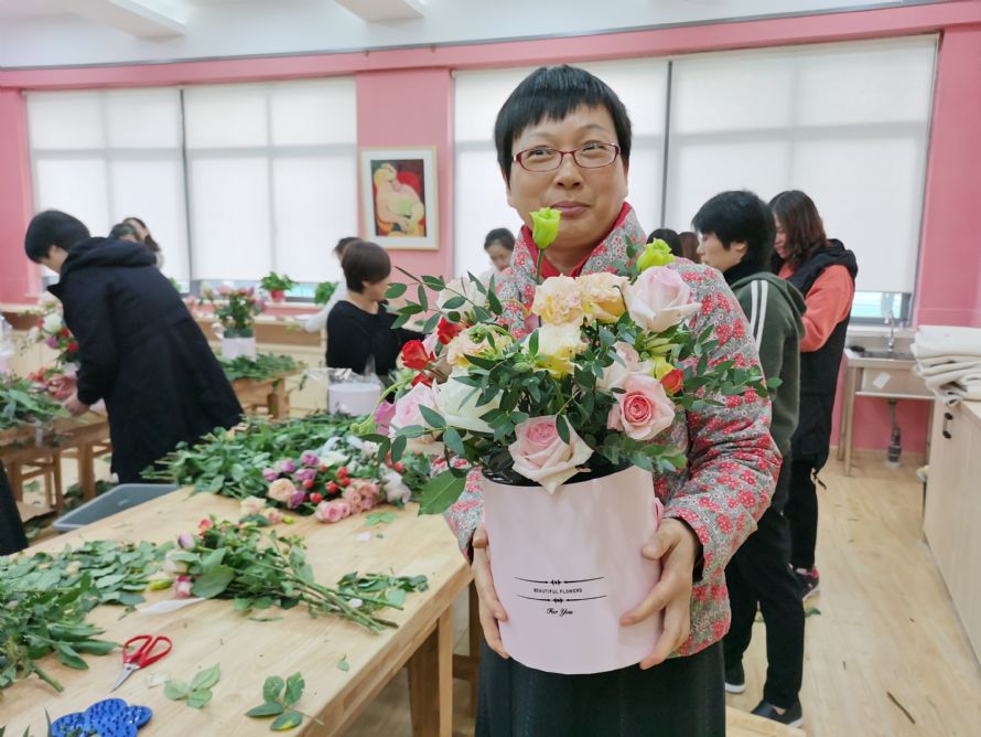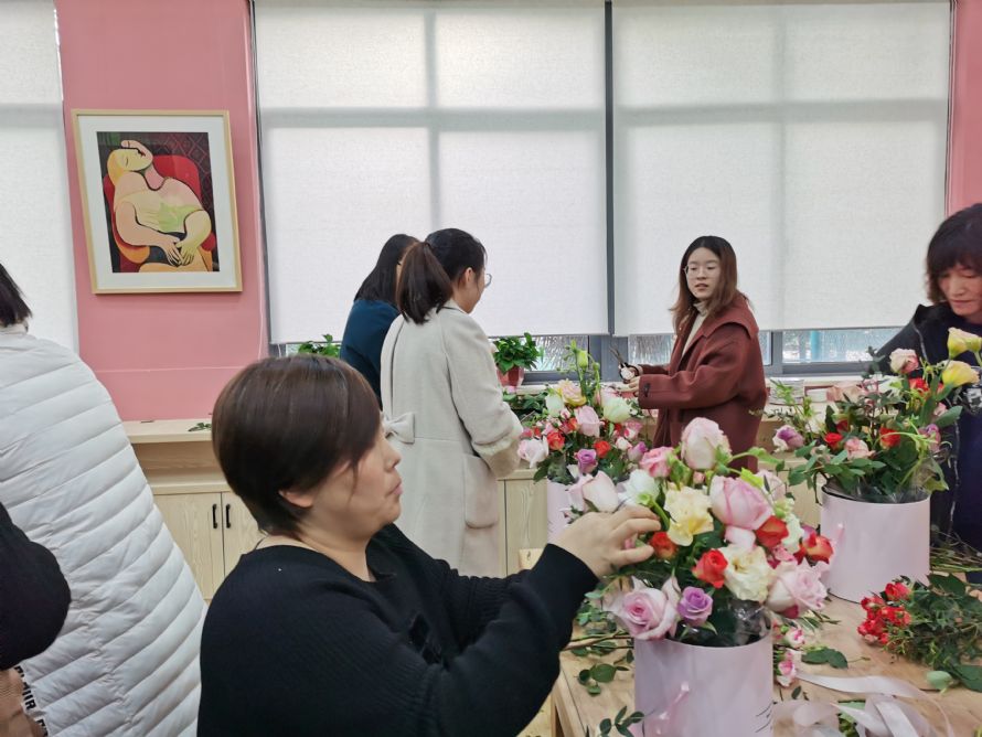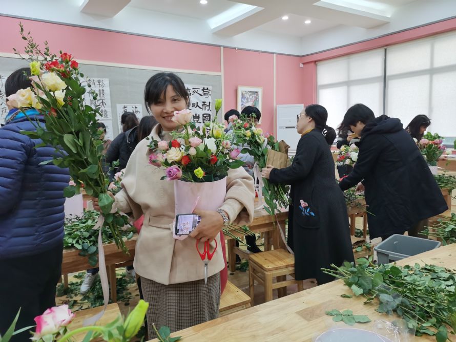 经过约1小时的劳动,一桶桶花束跃然眼前。每份作品虽然制作方式大同小异,但是最终呈现的模样却是千姿百态。劳动是辛苦的,成果是丰硕的,结果是喜人的,抱着精美花束的每位教师脸上的笑容就是最佳的注脚。