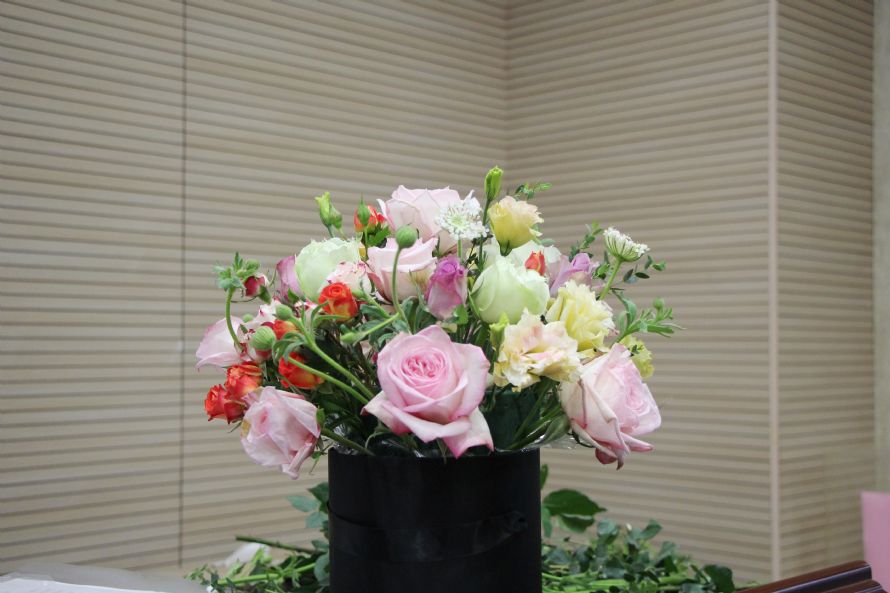 没曾想,最难的部分在最后的环节——花草的融合。如果说花是精灵,那么作为点缀的草就是花的烘托。但在花丛中见缝插针地加入白翠珠、尤加利,确实很考验人的功力。怪不得,花艺师说,花束最难的就是“配”草。确实,在抱抱桶中,草绝对称不上是主角,但花却会因为草而添彩增色。著名的“7秒定律”告诉我们人在确定对某物感兴趣的7秒内,色彩的作用占到67%。其中,草功不可没!合理的花草搭配会让整个作品摆脱沉闷杂乱,尽显风姿和互补平衡。