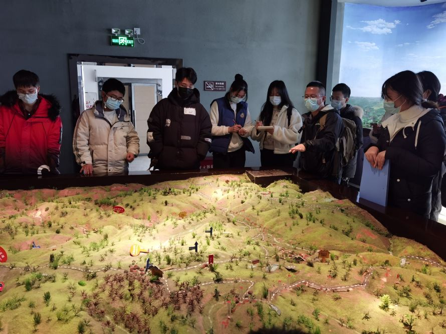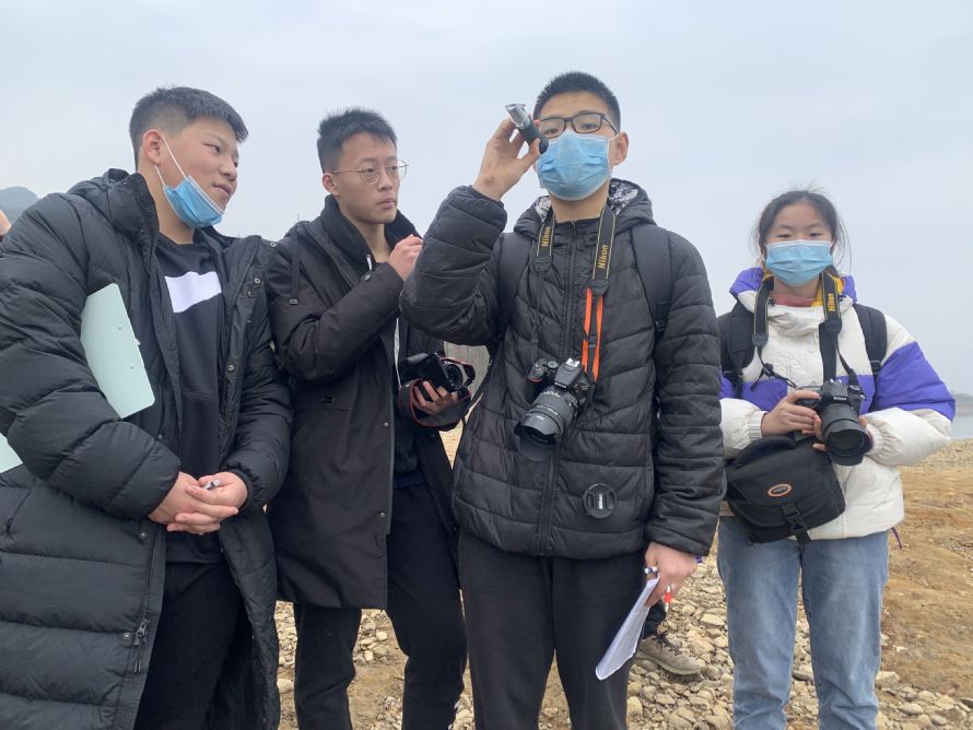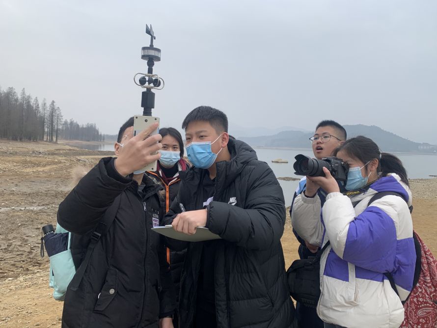 本次研学的第一站是在四明湖。四明湖水库位于梁弄镇的中心位置,甬江流域的姚江上游,是集防洪、发电、养鱼、供水为一体的大型水库。冬季是四明湖水库的枯水期,湖床部分裸露,湖水水位较低。同学们观察了丰水期的界限,对冬季湖水水位低的原因进行了探讨;利用手持气象仪,对四明湖区的风速、风向、气温、湿度等进行测量,并利用地理学的湖陆风原理对测量结果进行分析;考察湖相沉积地貌、侵蚀地貌,对湖泊沉积物颗粒大小和淤泥质区开展探究;利用盐度计对湖水盐度进行测量,解读影响盐度的要素。短短一个多小时,满满的活动和探讨,研有所得,学有所用。