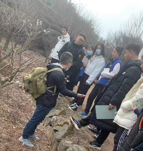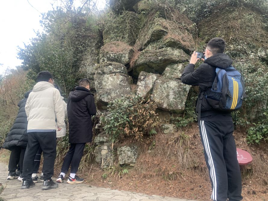 在入住四明山森林公园并吃完午饭后,研学队驱车前往四明山地质公园进行考察。四明山地质地貌特点突出,海拔高度600-800米,呈现出古夷平面(古风化壳)+玄武岩堆积面(现代风化壳)组成的“双风化壳”现象,各种夷平作用形成陆地平面,包括准平原、山麓平原、风化剥蚀平原等,具有很高的科学价值和学科价值。师生们首先在展厅从宏观上观察四明山地区的分布,并从内外力角度对四明山区的形成原因、古夷平面的形成过程和地貌演变现状进行探讨。实地考察四明山地质公园观景台和玻璃栈道,观察分水岭的位置和形态、山区聚落建设的位置和道路分布特征、缓坡的梯田农业、植被垂直分异差异、茶树的生长环境要求和特点。翻山越岭,考察火山地貌分布及其岩石特点,观察玄武岩柱状节理陡崖、花岗岩风化石蛋、石屏、石柱、悬岩及裂隙泉等,并结合景区地质演化图分析各类地表形态的成因。