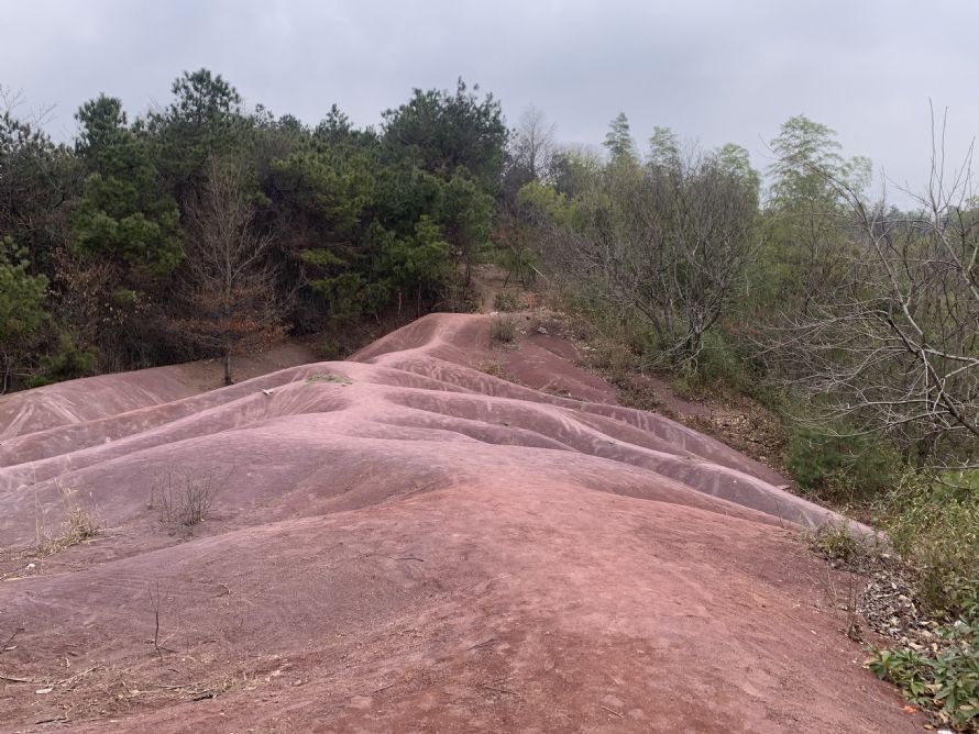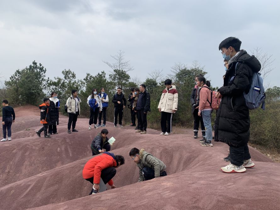 第二站是大岚镇的丁家畈,这里隐藏一座“火焰山”,是较为典型的红层地貌。红层地貌是一个广泛的地理学概念,地理教材中的丹霞地貌就是一种红层地貌。研学队考察了丁家畈红层的分布范围、形状,对风化作用较为严重的地区进行了重点考察,在脊部、沟谷、斜坡等不同部位的砂岩进行采样;讨论了粉砂、细砂、壤土的形成及其对农业发展的影响;考察丁家畈山区的水土流失情况;在山坡上了解物理风化、生物风化对成土母质的作用等。