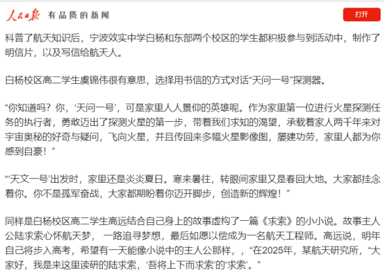 4月24日,宁波“中国航天日”科普活动组委会授予宁波市效实中学在内的10所学校为宁波“中国航日天”全民科普活动优秀组织学校。