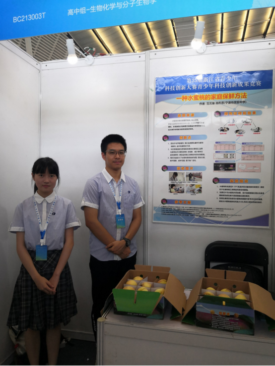 范艺臻同学和胡乔恩同学自20201月起关注身边农产品的保鲜问题,积极寻找简便易行的家庭保鲜方法。参加本次大赛终评的“一种水蜜桃的家庭保鲜方法”选题贴合实际难度适中,具有一定的新颖性和可行性,实用性较强。本项目实验设计合理,实验方法多样,结果真实可信,具有一定的推广价值。两位同学赛前积极准备赛中与专家同伴充分交流赛后积极反思在科技创新体验活动中成长