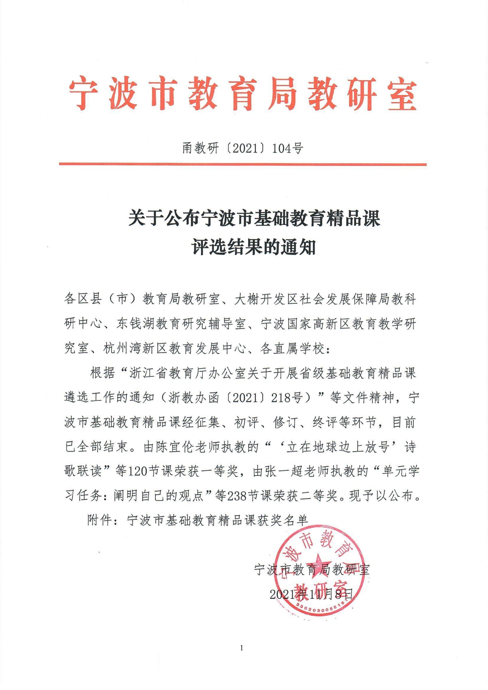 11月17日,宁波市教育局教研室下发了甬教研〔2021〕104号文件《关于公布宁波市基础教育精品课评选结果的通知》,公布了宁波基础教育精品课获奖名单,我校三位老师执教课程入选其中。由屠艳宁老师执教的课“M2 Unit2 Wildlife Protection-Opening page,Listening and Speaking”、张潆尹老师执教的课“质点 参考系”荣获一等奖,由徐青老师执教的课“M2 Unit2 Video time:Elephant Whisperers”荣获二等奖。