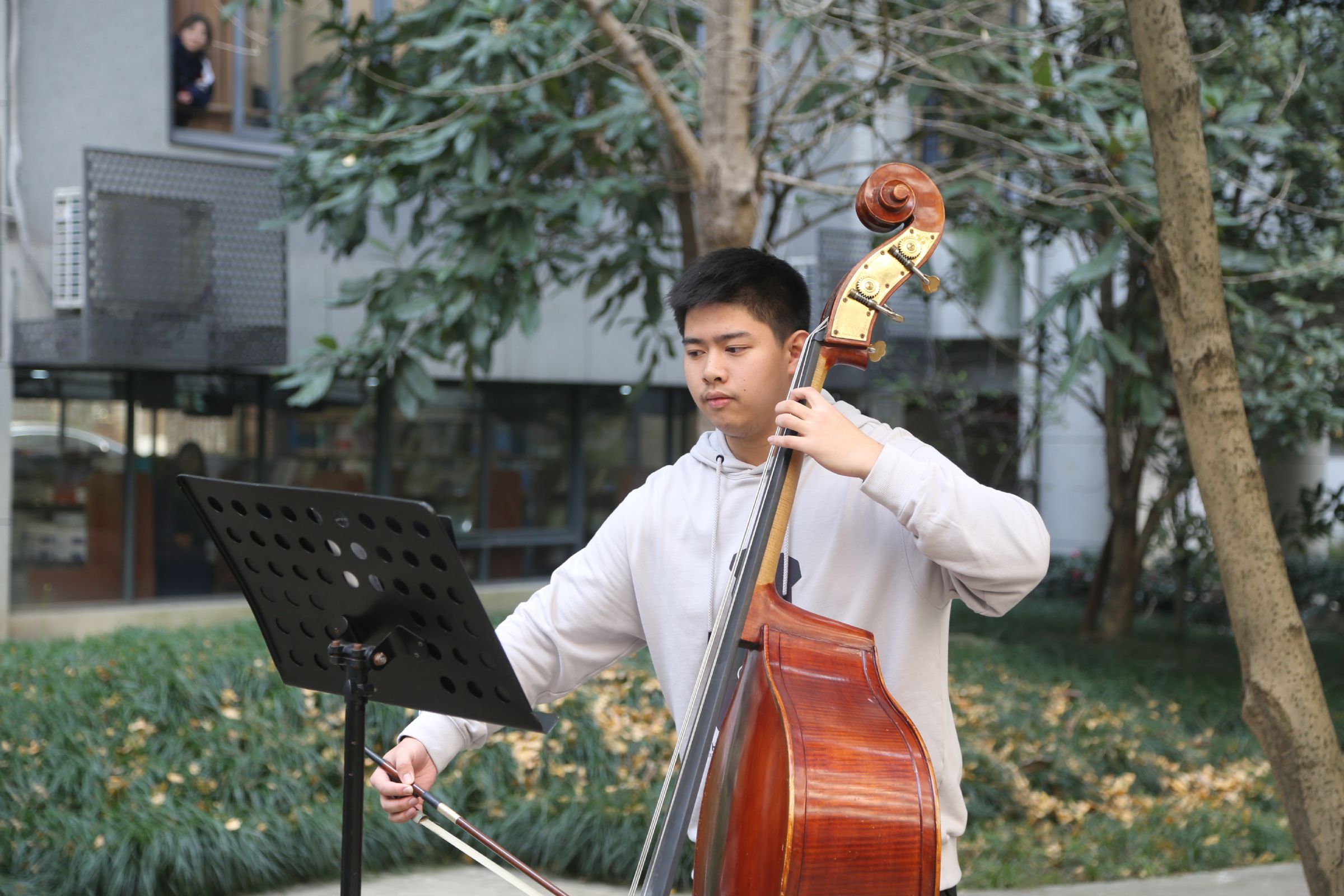 学生表演的舞台就在教学楼中庭的“青蒿素分子式”塑像旁。当音乐声响起,同学们或扶窗探看,或驻足聆听,老师们也纷纷拿出手机,拍下这动人的场景。