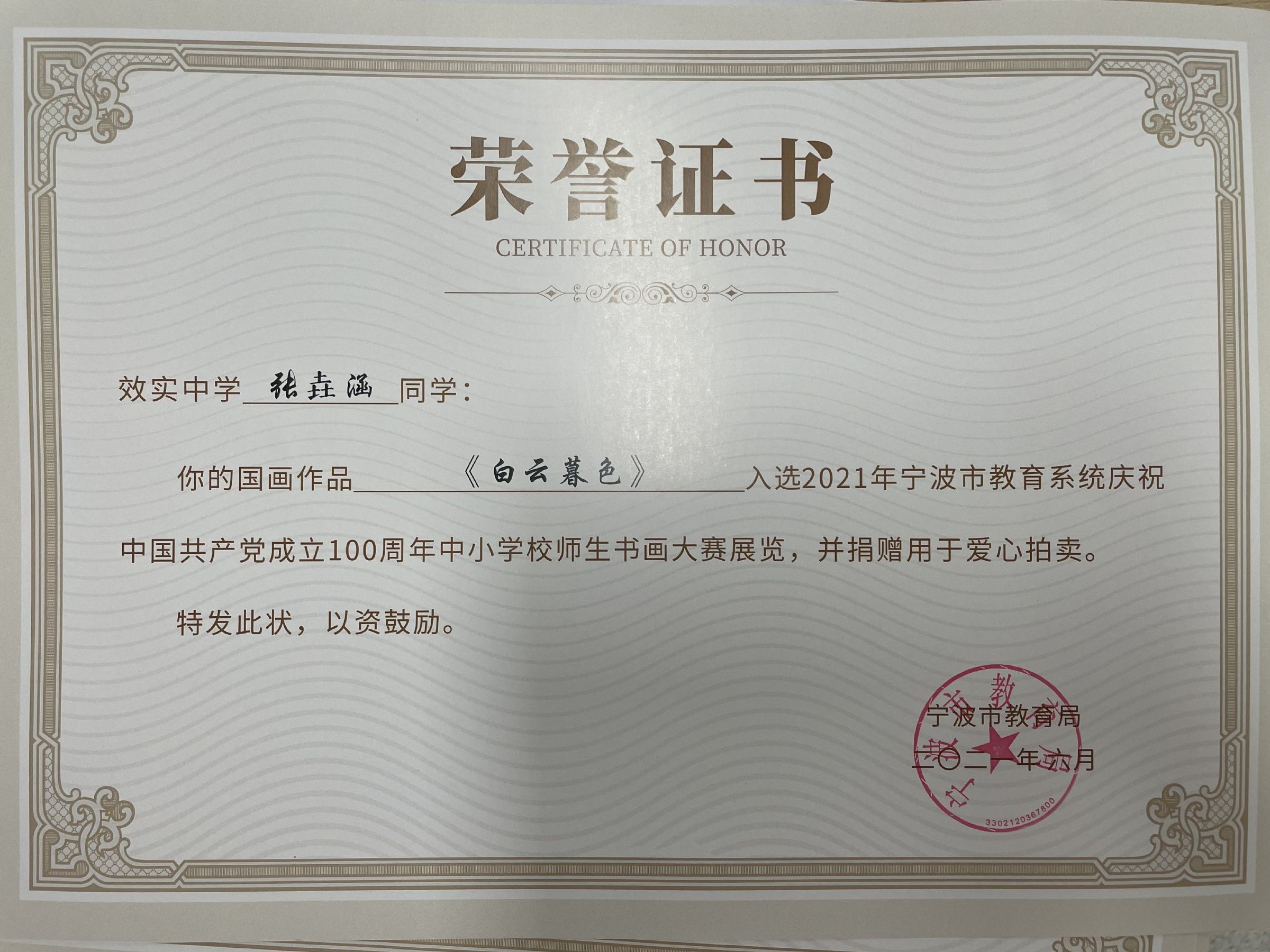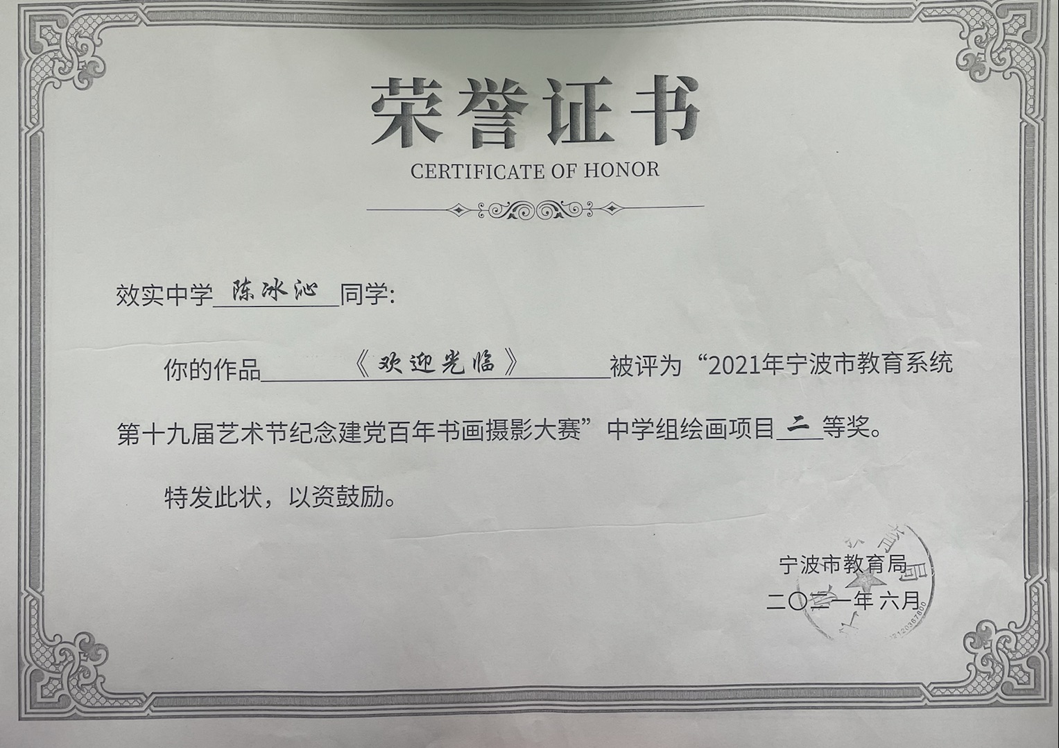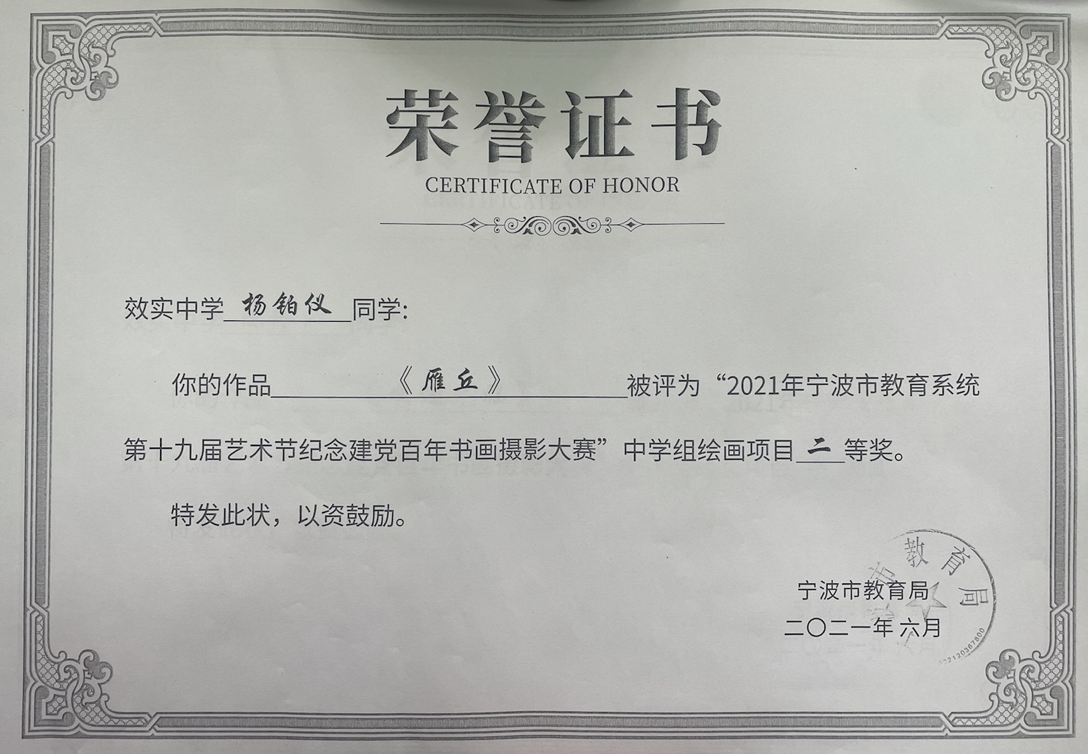 2021年9月,在公布的宁波市中小学生艺术节,以“纪念建党百年书画摄影大赛"为主题的比赛结果中,效实学子再现书画光彩,取得优异成绩,有国画、版画、素描、色彩、书法等作品。这些作品在宁波市教育局系统庆祝中国共产党成立100周年中小学师生书画大赛中展出,并捐赠用于爱心拍卖。其中发来的成绩中还有D2304班毕鑫同学获得2020年浙江省艺术节二等奖。恭喜各位同学,希望有更多的学生热衷绘画,再创佳绩。