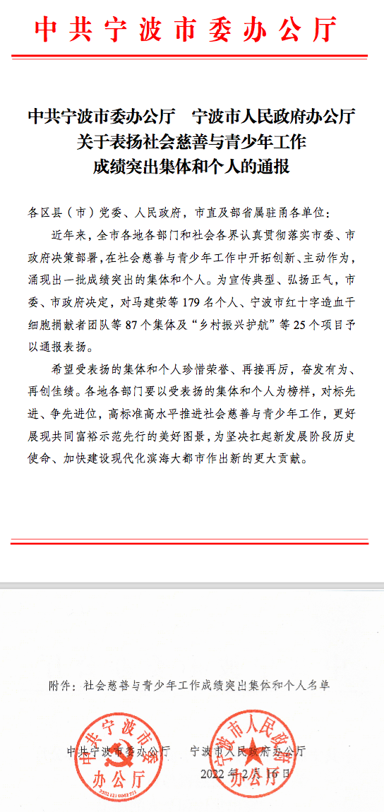 近日,中共宁波市委办公厅、宁波市人民政府办公厅公布社会慈善与青少年工作成绩突出集体和个人名单,宁波效实中学团委获评宁波市成绩突出共青团组织。