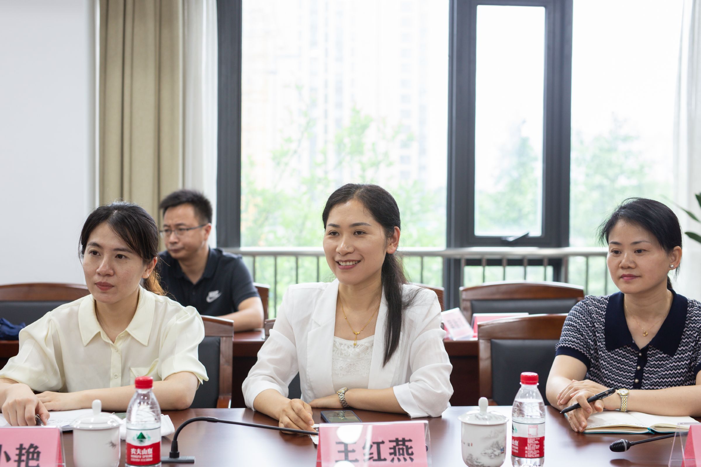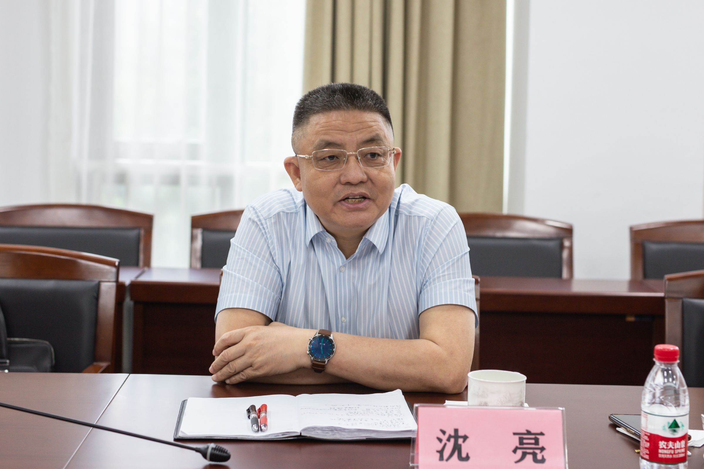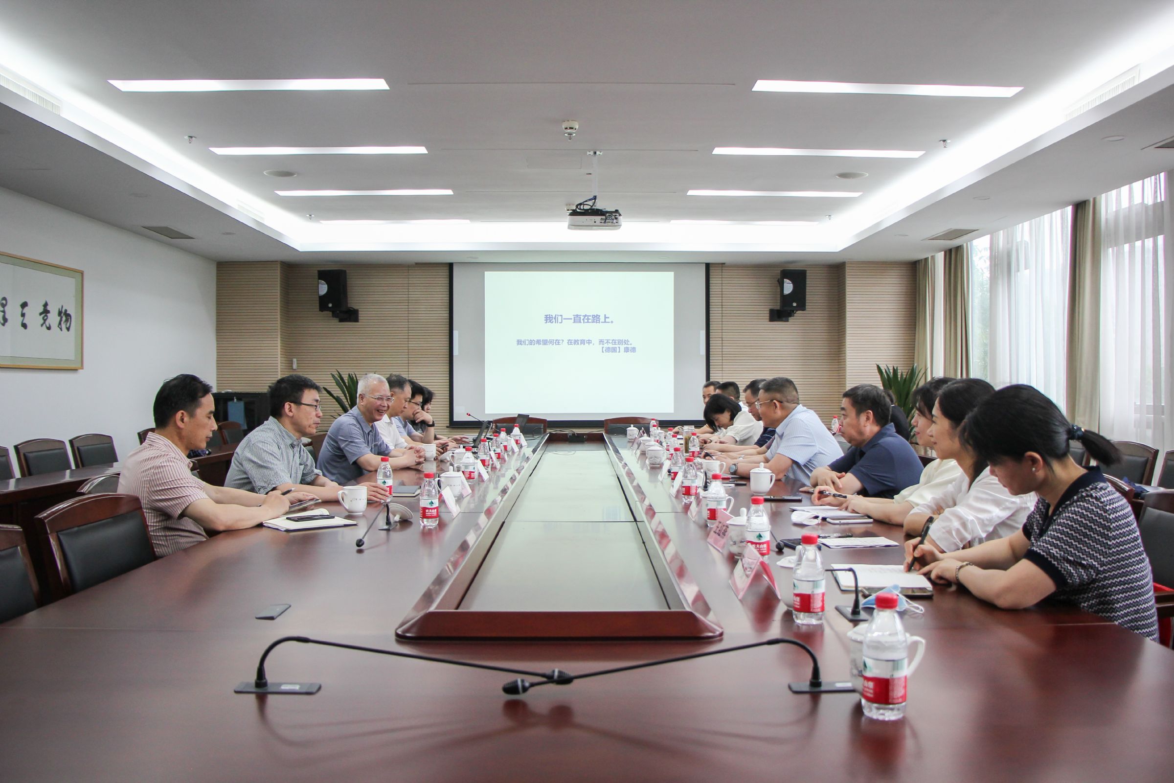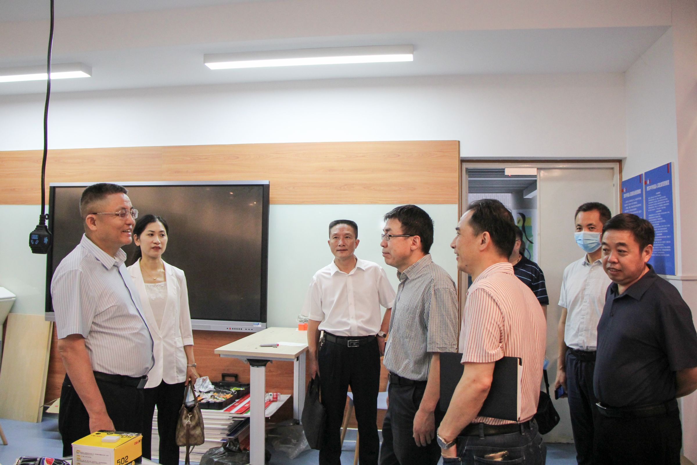 考察团一行在校领导班子的陪同下,先后参观考察了校园文化墙、物理创新实验室、海洋生物展示馆、物理学科走廊等地。随后,一行人来到行政楼205会议室开展座谈交流。