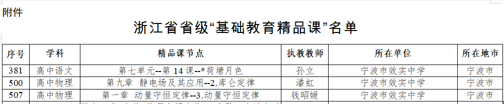 近日,浙江省教育厅公布了2022年省级“基础教育精品课”评审结果,我校孙立老师的《第七单元--第14课--*荷塘月色》(高中语文)、潘虹老师的《第九章 静电场及其应用--2.库仑定律》(高中物理)、钱昭媛老师的《第一章 动量守恒定律--3.动量守恒定律》(高中物理)3节课成功入选,并推送至教育部参加“基础教育精品课”遴选。祝贺所有获奖老师!