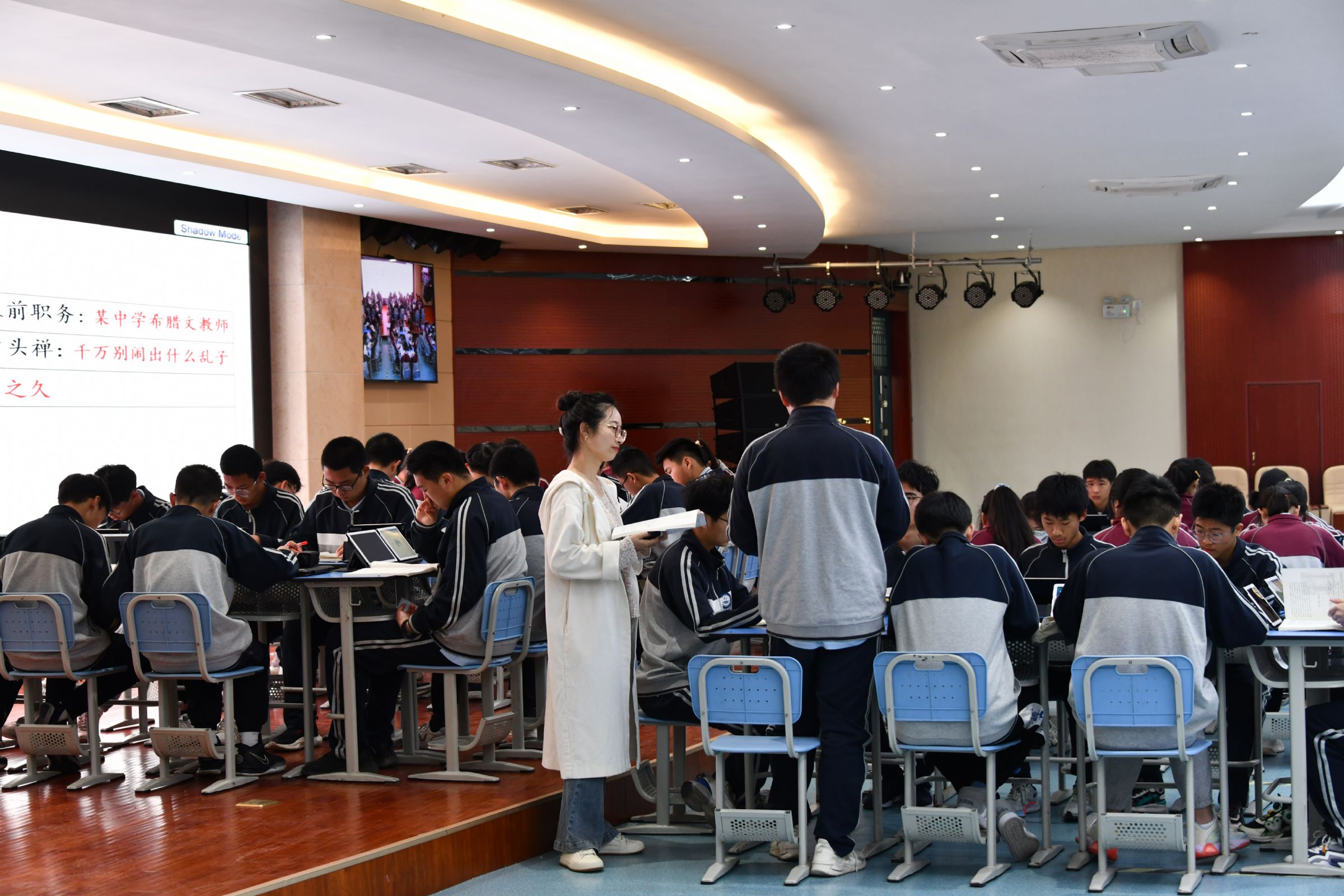 活动中,效实中学朱凯嘉老师、王天瑜老师、沈钰吉老师以娴熟的教学技艺、丰富的教学经验和扎实有效的课堂训练,呈现了三堂高水平的优质课。朱凯嘉老师执教《装在套子里的人》(语文),王天瑜老师执教人教版选修一《Unit4 Reading and Writing Animal Body language》Workbook(外语),沈钰吉老师执教《空间直线、平面的垂直》复习课(数学)。